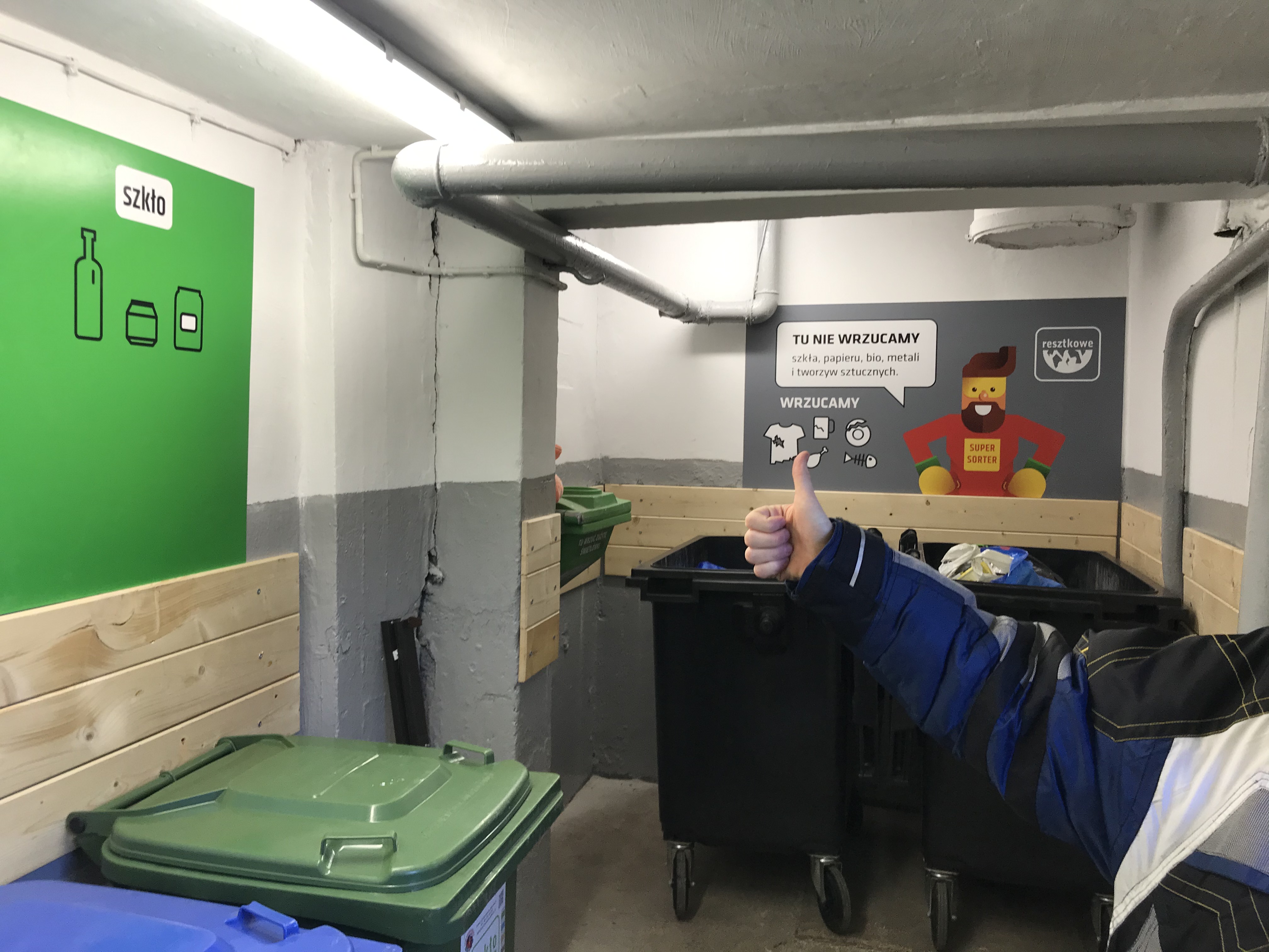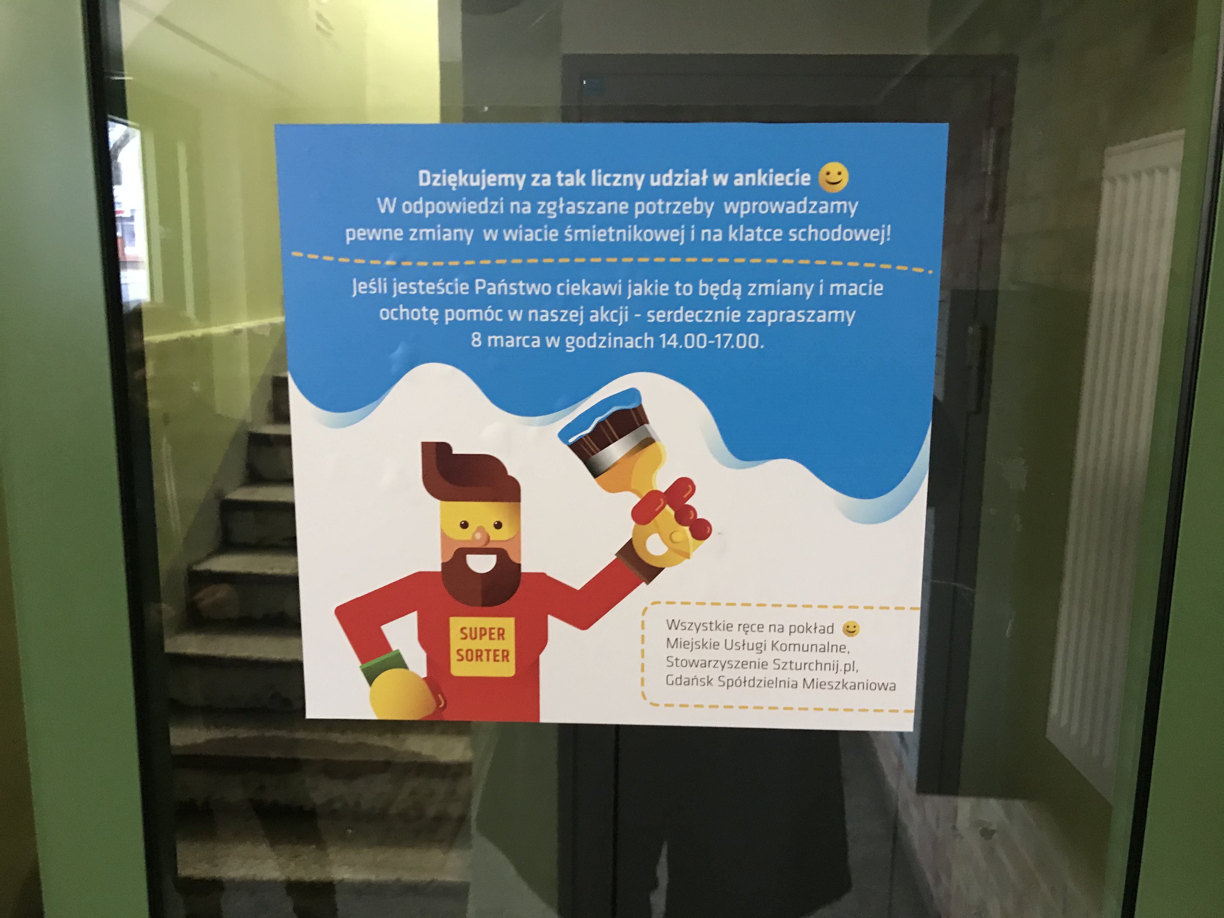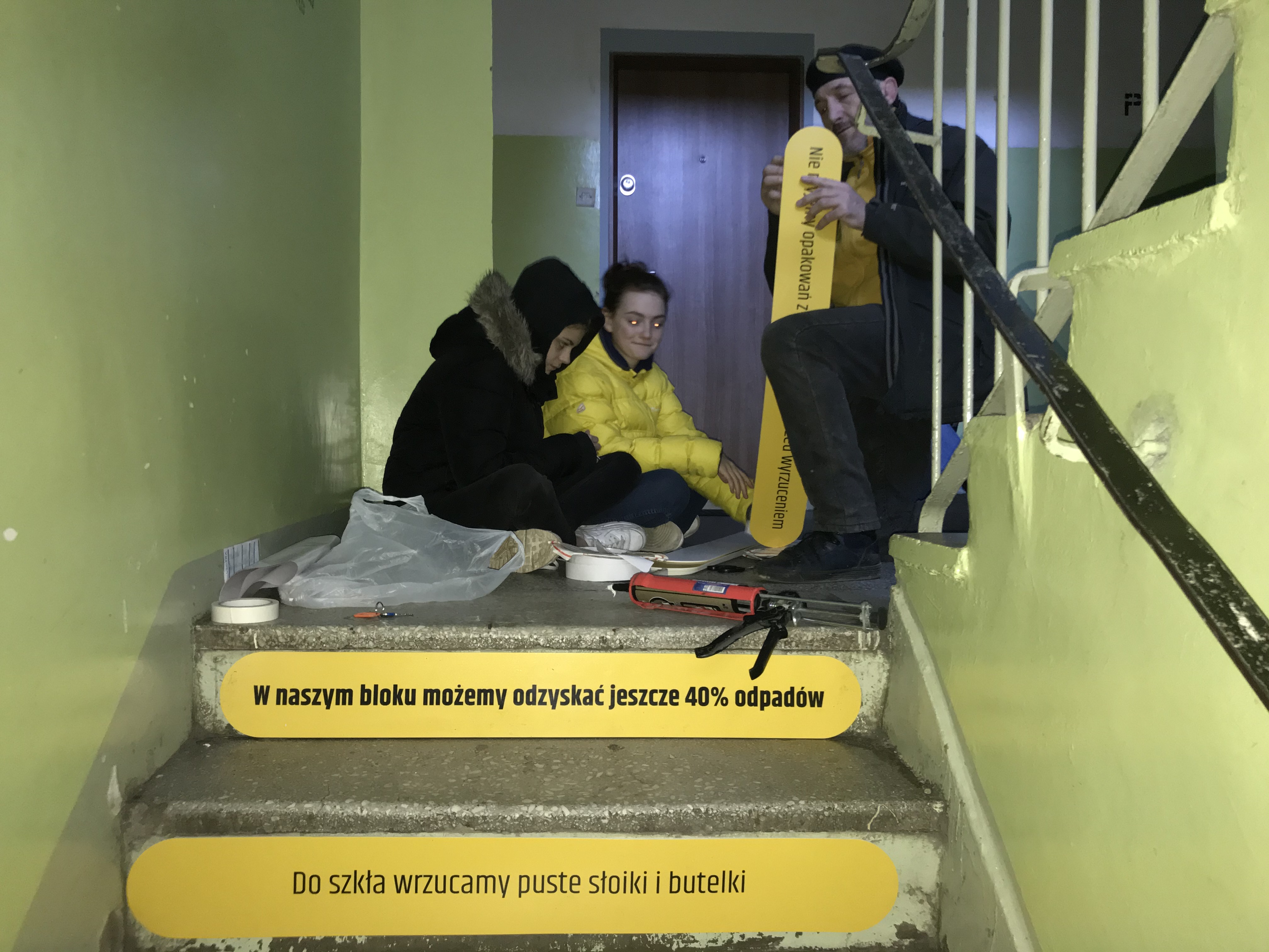 Aby zmienić nawyki mieszkańców, postanowiliśmy na początek przeprowadzić z nimi rozmowy, a następnie podjęliśmy konkretne prace, czyli wprowadziliśmy w życie „szturchającą” interwencję. W ramach tych działań, odświeżyliśmy wiatę śmietnikową, zmieniliśmy wielkość i aranżację pojemników. Przygotowaliśmy też szturchające komunikaty na klatkach i motywatory w windzie.